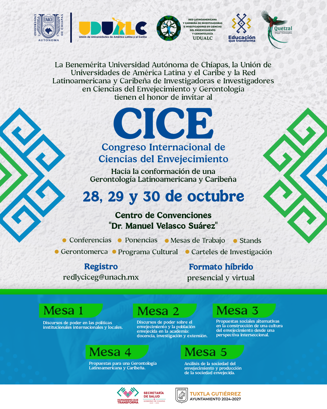 La Benemérita Universidad Autónoma de Chiapas te invita al Congreso Internacional de Ciencias del Envejecimiento, un espacio de diálogo y colaboración hacia la conformación de una Gerontología Latinoamericana y Caribeña.